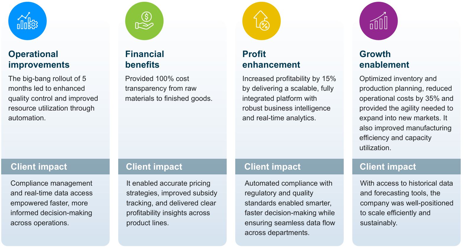 The SAP S/4HANA implementation successfully transformed the client’s manufacturing operations from manual, fragmented processes to an integrated, automated system. This led to streamlined operations, enhanced quality control, and supported strategic growth, establishing a foundation for future business expansion and market competitiveness.